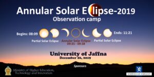 Northern Sri Lanka will witness an annular eclipse on 26th December 2019. Ancients feared solar eclipses and considered them a sign of evil to come. Yet some philosophers of antiquity and Panchangam (Hindu Calendar) understood that solar eclipses happen when the moon obscures the sun. Modern science enabled the calculation of the dates and times of eclipse occurrences to the utmost precision. Measurements conducted during solar eclipses had also unravelled many physical phenomena. A total or an annular eclipse appearing in the skies above the land you live in is regarded as a blessing. These awesome celestial events arouse curiosity and masses watching the display, who feel that “all are humbly united in front of the sun and moon”. The appearance of a total or annular solar eclipse is a rare opportunity to cultivate scientific inquisitiveness and human unity. University of Jaffna, in collaboration with University of Colombo and Western Norway University of Applied Sciences, plans to organise an eclipse observing camp in Jaffna and Killinochchi, mainly for students and conduct lectures on related astronomical topics. Plans are also made to conduct scientific measurements for research during the eclipse. These activities are co-sponsored by the Ministry of Science, Technology and Research, Sri Lanka and the HRNCET project (http://project.jfn.ac.lk/hrncet/).